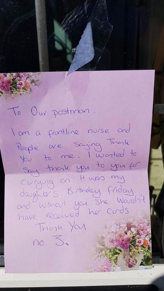 A frontline nurse made Dorking based postman Billy Hutchison’s day by leaving this lovely thank you note in her window.