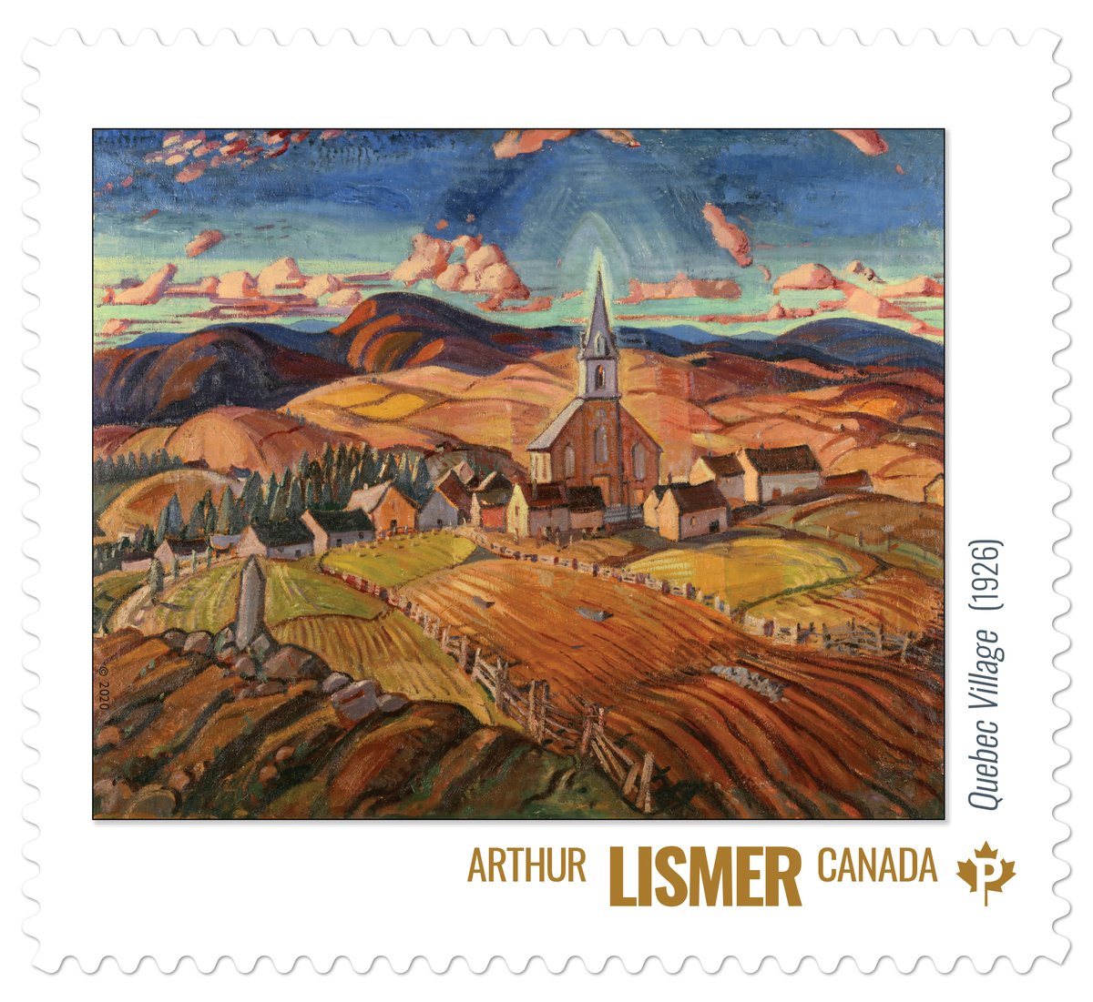 This stamp features the painting “Quebec Village” (1926), by Arthur Lismer. You can see the painting in person at @aeartcentre. #GroupOfSevenAt100 pic.twitter.com/eGesJAUPN2